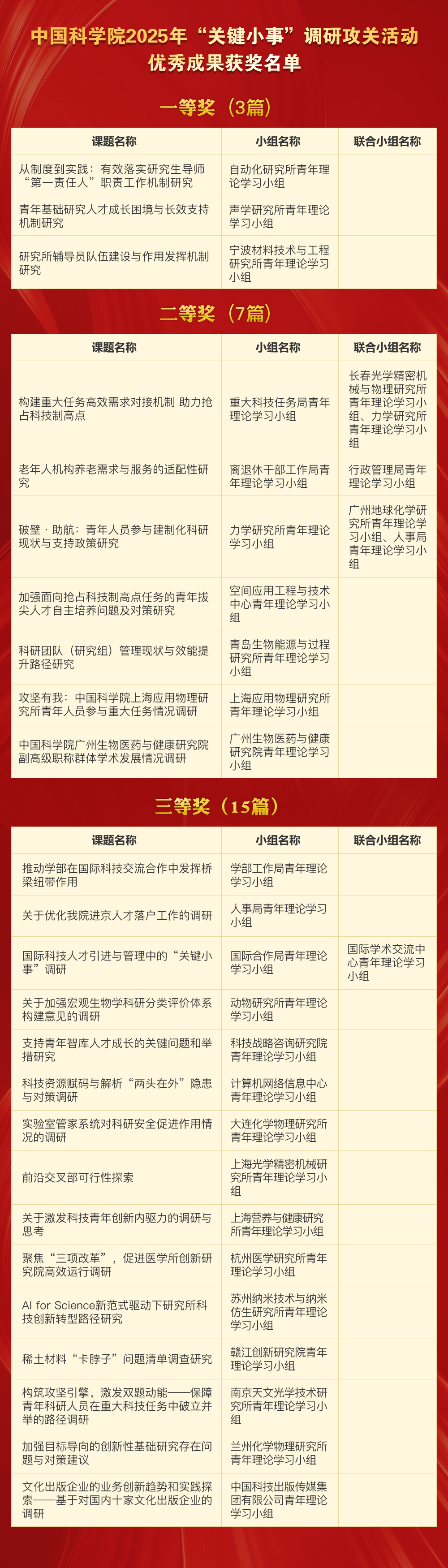 經(jīng)院屬各單位黨委和院機(jī)關(guān)各黨組織推薦、院團(tuán)委組織專家初評(píng)、召開(kāi)交流評(píng)選會(huì)評(píng)審等多輪篩選,最終評(píng)選出優(yōu)秀調(diào)研攻關(guān)成果25篇,其中,一等獎(jiǎng)3篇,二等獎(jiǎng)7篇,三等獎(jiǎng)15篇。