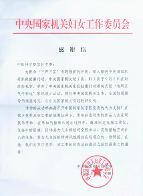 在“清風正氣傳家遠”家庭助廉主題活動開展過程中,我院京區(qū)黨委高度重視、京區(qū)紀委和院婦工委及時布置,共收到各項材料200多份。院婦工委舉薦院部機關薛淮同志作品,并在頒獎式上做了現(xiàn)場展示。中央國家機關婦工委發(fā)來感謝信,對京區(qū)黨委的大力支持、對我院婦工委的扎實推動、對薛淮同志的認真參與,表示了衷心的感謝。