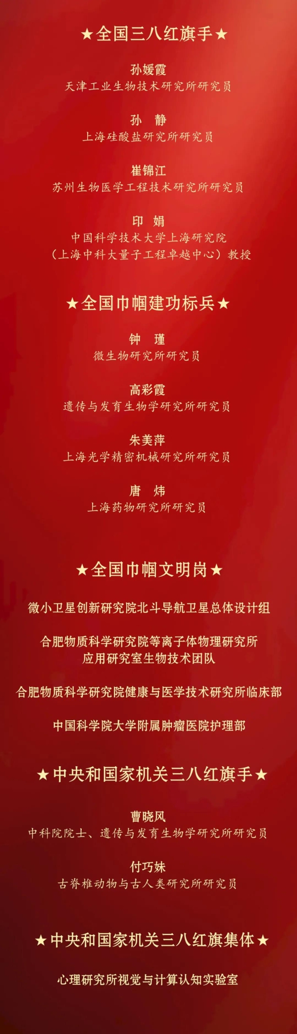 其中,中科院天津工業(yè)生物技術(shù)研究所研究員孫媛霞、上海硅酸鹽研究所研究員孫靜、蘇州生物醫(yī)學(xué)工程技術(shù)研究所研究員崔錦江、中國科學(xué)技術(shù)大學(xué)上海研究院教授印娟等4人被授予2020年度“全國三八紅旗手”稱號。