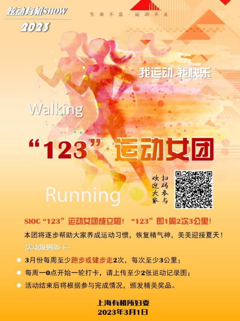3月6日,組織2023年炫動(dòng)有機(jī)SHOW“123運(yùn)動(dòng)女團(tuán)”主題活動(dòng),逐步幫助大家養(yǎng)成運(yùn)動(dòng)習(xí)慣,恢復(fù)精氣神,美美迎接夏天!大家每周至少跑步或健步走2次,每次至少3公里,運(yùn)動(dòng)健身的同時(shí)緩解科研壓力,放松身心。本次活動(dòng)有160余人參加。
