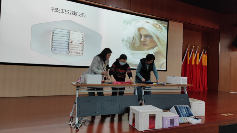 賈琳的報告從收納的含義、技巧等方面,闡述了收納是通過重新考慮個人與物品之間的關(guān)系,斷舍離 “不需要、不合適、不舒服”的東西。以此來了解自己,整理自己內(nèi)心的混沌,讓人生更舒適的行為技術(shù)。并現(xiàn)場教授了日常的襯衫、毛衣、牛仔褲的折疊方法和技巧,現(xiàn)場女職工積極參與疊衣服大比拼,氣氛活躍。