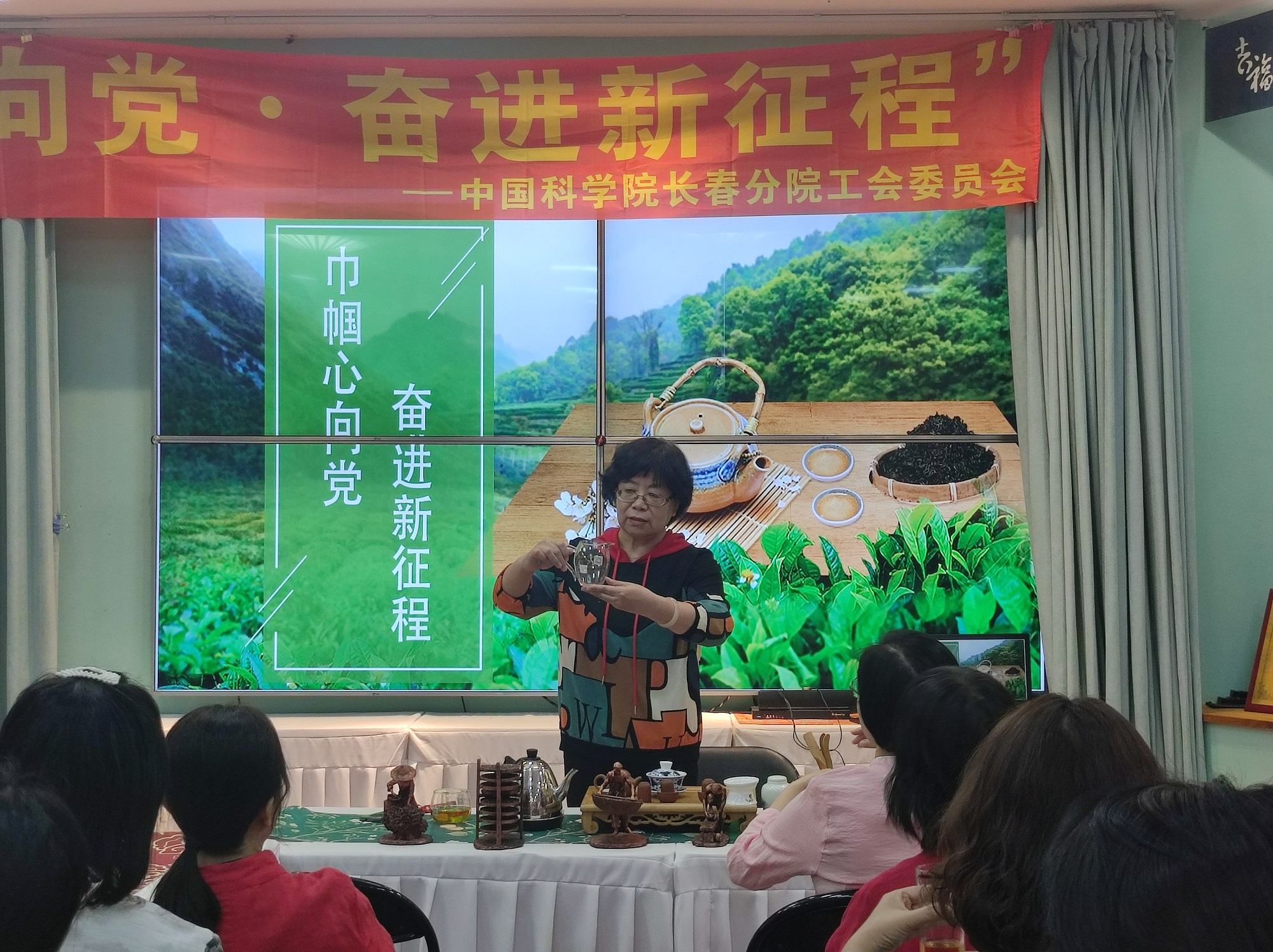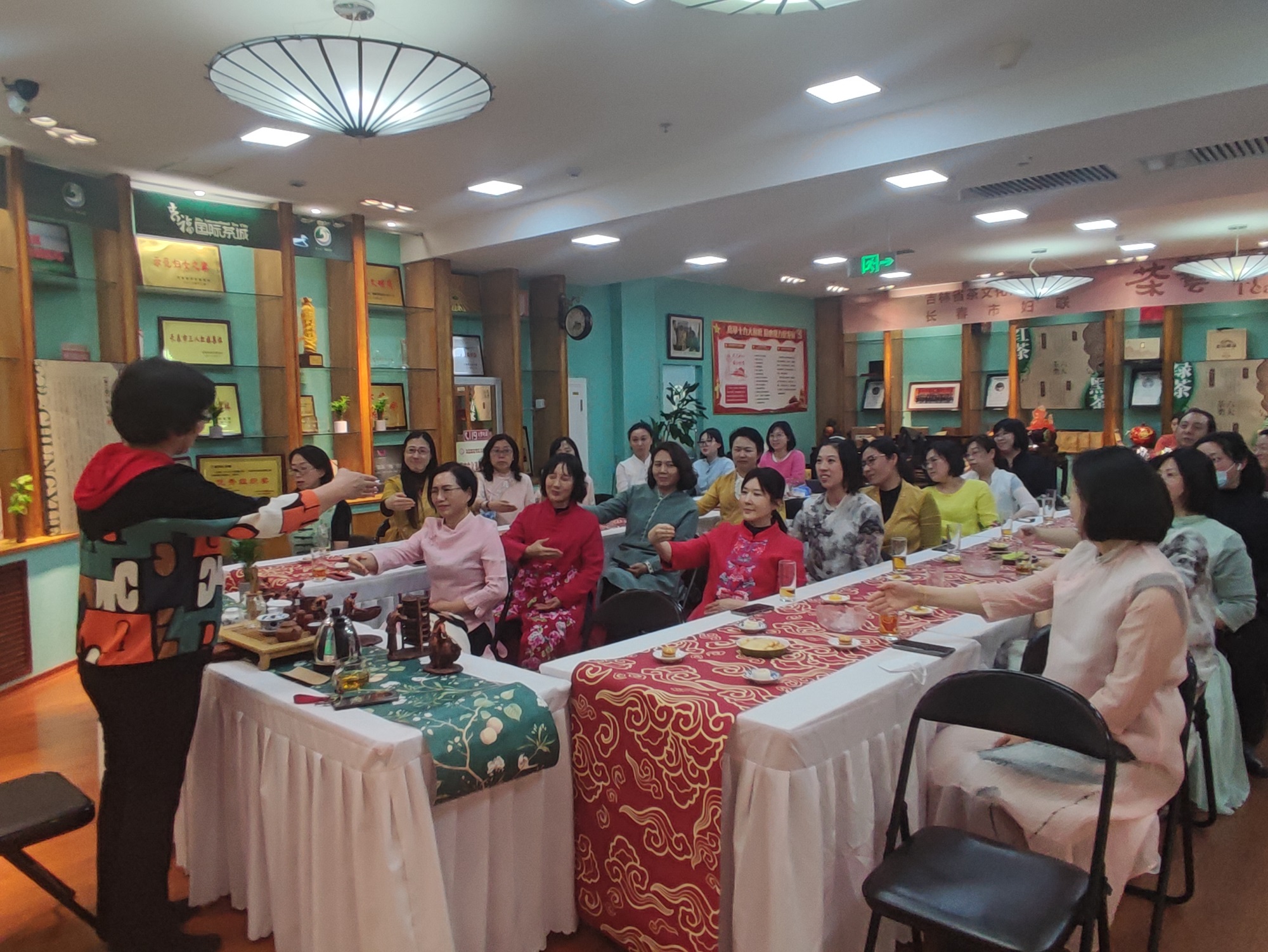 隨后,吉林省茶文化產(chǎn)業(yè)協(xié)會秘書長、國家級茶藝高級技師趙金榮為大家現(xiàn)場授課,她圍繞著中國茶文化的起源與發(fā)展歷史,從中國茶的分類、制茶的工藝以及茶的功效與作用等帶領(lǐng)大家領(lǐng)悟了中國傳統(tǒng)茶文化的魅力,并現(xiàn)場向大家傳授了基本茶禮、茶道,勉勵大家做懂禮、知性、優(yōu)雅的新時代女性。伴隨著輕緩的樂律和悠悠的茶香,大家一邊學(xué)習(xí)中國傳統(tǒng)茶道禮儀,一邊愜意舉杯品茶交流,識茶趣、品茶韻、悟茶道,在一提一放之間感受傳統(tǒng)茶文化的魅力,共度了“一杯茶”的美好時光。