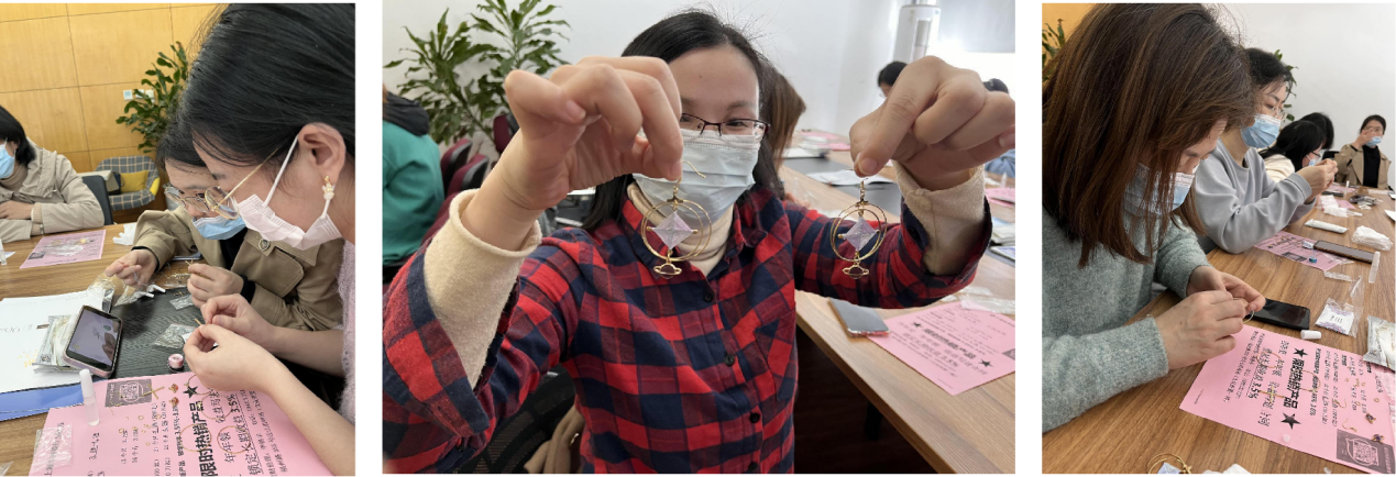 纏線耳環(huán)是一種富有特色的配飾。老師先介紹了耳環(huán)制作所需材料,介紹完材料后進入動手制作環(huán)節(jié),各種款式的耳環(huán)、項鏈等材料包不一而足。大家一邊觀看教學視頻一邊動手制作,普通的彩線變成了時尚精巧的飾品。看著自己美麗的作品,每個人的臉上都洋溢著燦爛的笑容。制作成功后,大家迫不及待地戴在耳朵上。