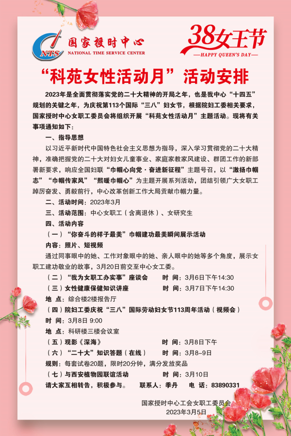 為慶祝第113個(gè)國(guó)際“三八”婦女節(jié),動(dòng)員廣大女職工踐行新思想、建功新時(shí)代、展現(xiàn)新作為,根據(jù)院婦工委相關(guān)要求以及研究所實(shí)際,國(guó)家授時(shí)中心工會(huì)女職工委員會(huì)組織開展了系列“科苑女性活動(dòng)月”活動(dòng),活動(dòng)受到了黨委和工會(huì)的大力支持,既愉悅了廣大女職工身心,也為研究所創(chuàng)新文化建設(shè)起到了積極的促進(jìn)作用。