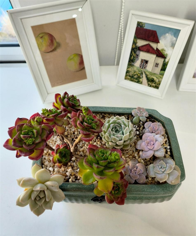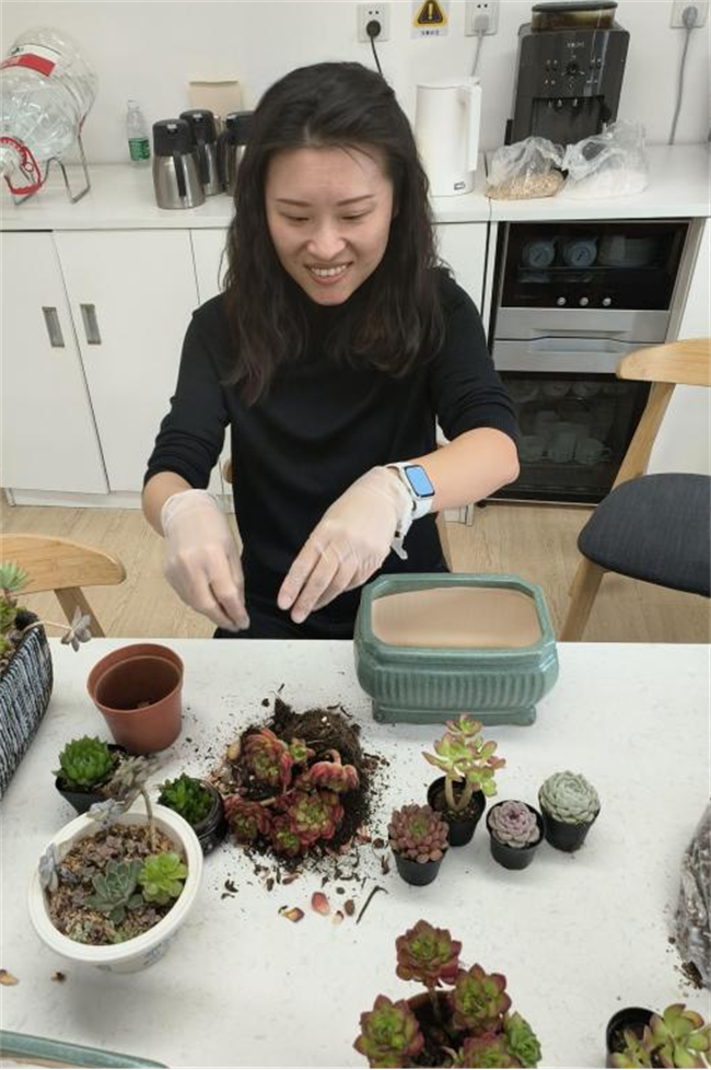 大家都沉靜在自我創(chuàng)作、欣賞之中,一顆顆清新可愛的多肉植物,在大家的巧手下,變成了一個個微盆景,充滿著詩情畫意。