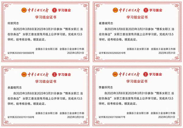 3月份組織參加全國總工會女職工部和全國總工會法律工作部在“學(xué)習強會”平臺舉辦女職工普法宣傳月線上公開學(xué)習班。宣傳貫徹新修訂的《中華人民共和國婦女權(quán)益保障法》,大力營造尊法學(xué)法守法用法的良好氛圍,促進工作場所性別平等。女同胞們踴躍參加,學(xué)習了婦女勞動和社會保障權(quán)益、婦女人身和人格權(quán)益、婦女婚姻家庭權(quán)益并取得了結(jié)業(yè)證書。
