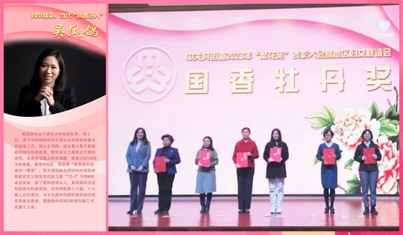 3月7日下午,中關村街道婦女聯(lián)合會舉辦了中關村街道2023年“繁花獎”表彰大會暨地區(qū)婦女聯(lián)誼會。集中表彰一批在建設美麗、和諧、文明、科技、安全中關村中發(fā)揮突出作用的優(yōu)秀女性個人和團體。她們是來自中關村地區(qū)各社區(qū)、各領域、各行業(yè)的優(yōu)秀女性代表,在弘揚時代新風、構建和諧社會、促進地區(qū)發(fā)展、建設幸福家庭中發(fā)揮了積極作用。軟件所天基綜合信息系統(tǒng)重點實驗室吳鳳鴿副研究員作為科技領域的優(yōu)秀女性代表入選該獎,在現(xiàn)場接受了頒獎和表彰。