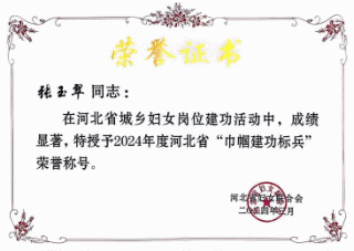 此外,河北省婦聯(lián)表彰了2024年度河北省城鄉(xiāng)婦女崗位建功先進集體(個人)。其中,中心張玉翠同志榮獲2024年度河北省“巾幗建功標兵”榮譽稱號。