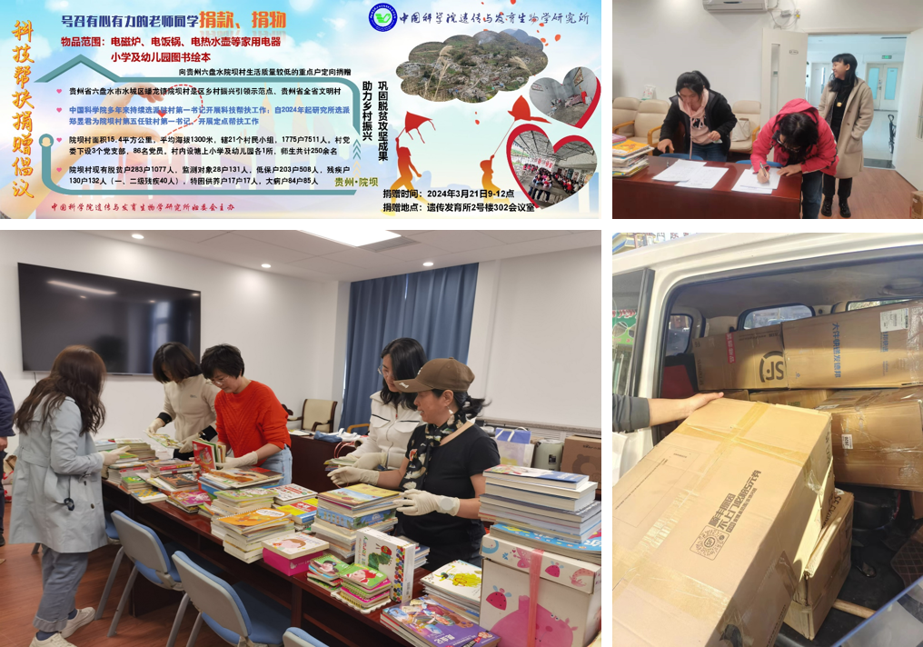 為充分發(fā)揮女性的榜樣作用,激發(fā)女職工的社會責任感,傳遞積極向上的社會價值觀,遺傳發(fā)育所婦委會組織了貴州貧困山區(qū)科技幫扶定向捐贈活動?;顒勇?lián)合遺傳發(fā)育所駐貴州省六盤水市水城區(qū)蟠龍鎮(zhèn)院壩村駐村第一書記鄭昱君同志開展。鄭昱君同志于2024年1月起被中國科學院選派為駐院壩村第一書記,開展科技定點幫扶工作。通過駐村同志搭建的有效橋梁,婦委會充分了解了幫扶當?shù)剞r(nóng)民生活情況及生活質(zhì)量較低農(nóng)戶的實際困難需求,并在研究所發(fā)起了針對需求的定向捐贈。活動得到全所師生的大力支持,大家紛紛慷慨解囊、踴躍捐款捐物,共計捐贈兒童繪本讀物和實用小家電設(shè)備14箱,愛心捐款6100元。通過這種定點捐贈的方式,切實做到及時有效解決群眾困難,也使女職工更近距離感受到公益的價值和意義,為構(gòu)筑和諧社會貢獻力量。