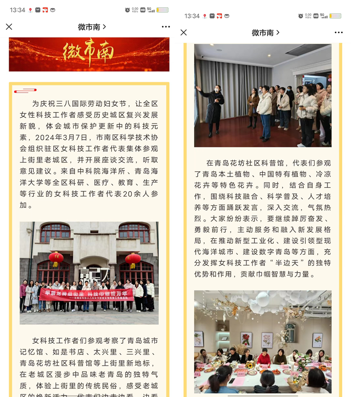 為慶祝三八國(guó)際勞動(dòng)?jì)D女節(jié),向女性科技工作者代表致敬,進(jìn)一步凝聚女性科技工作者獻(xiàn)身科技的力量,海洋所推選1名女科技工作者代表參加市南區(qū)科協(xié)組織的中山路歷史城區(qū)參觀活動(dòng),讓全區(qū)女性科技工作者感受歷史城區(qū)復(fù)興發(fā)展新貌,體會(huì)城市保護(hù)更新中的科技元素,并開(kāi)展座談交流,引領(lǐng)女科技工作者充分發(fā)揮“半邊天”的獨(dú)特優(yōu)勢(shì)和作用,貢獻(xiàn)巾幗智慧與力量。