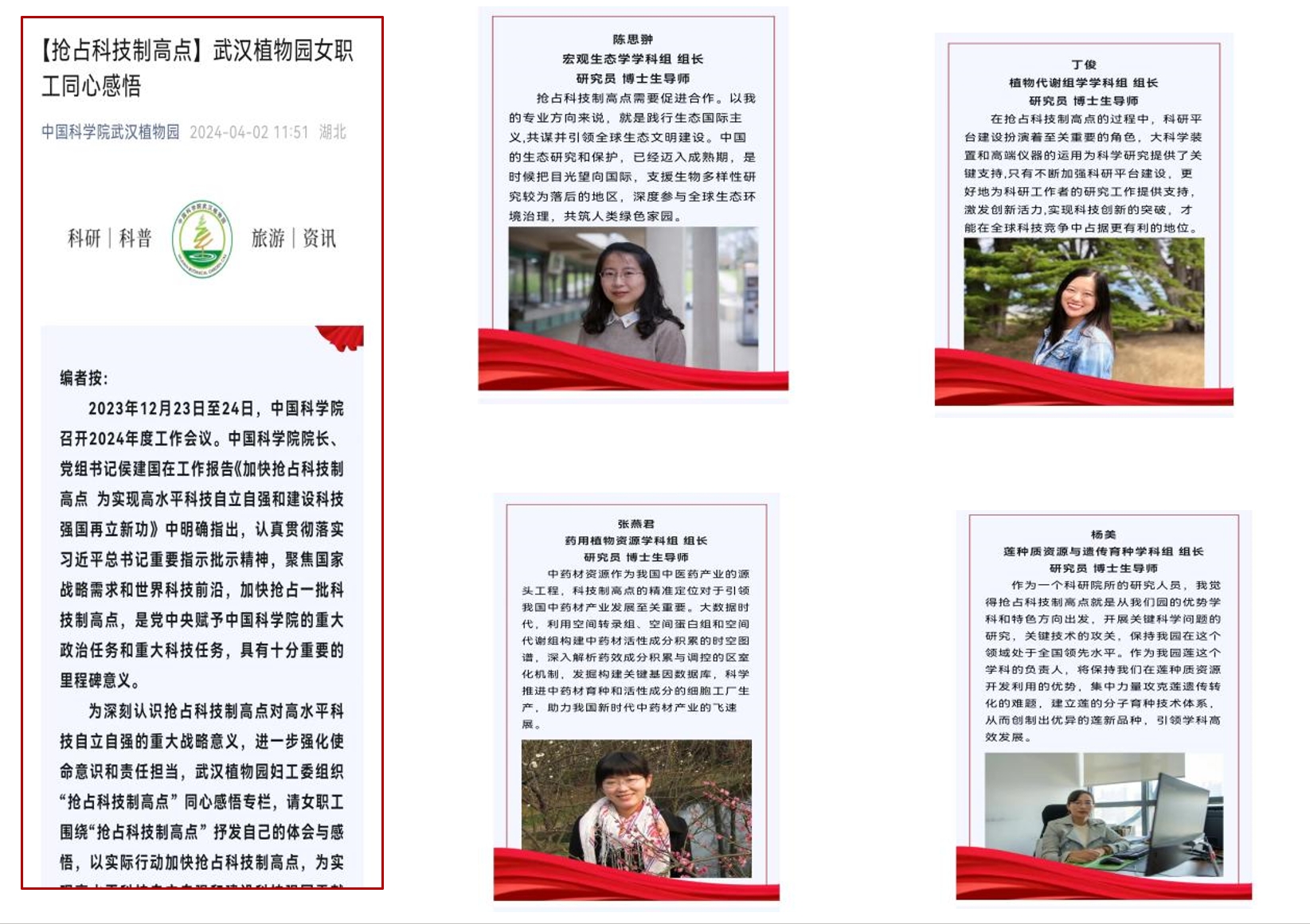為深刻認(rèn)識搶占科技制高點(diǎn)對高水平科技自立自強(qiáng)的重大戰(zhàn)略意義,進(jìn)一步強(qiáng)化使命意識和責(zé)任擔(dān)當(dāng),武漢植物園婦工委同步在官網(wǎng)、微信公眾號平臺策劃創(chuàng)建“搶占科技制高點(diǎn)”同心感悟?qū)冢埮毠@“搶占科技制高點(diǎn)”抒發(fā)自己的體會與感悟,以實(shí)際行動加快搶占科技制高點(diǎn),為實(shí)現(xiàn)高水平科技自立自強(qiáng)和建設(shè)科技強(qiáng)國貢獻(xiàn)自己的力量。園近20位女性學(xué)科帶頭人、研究員、部門負(fù)責(zé)人及一線職工參與,進(jìn)一步激發(fā)了女職工投身科技創(chuàng)新事業(yè)的使命感和責(zé)任感。
