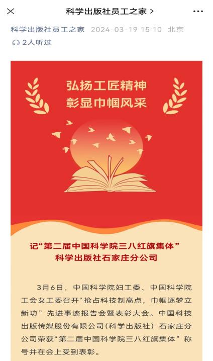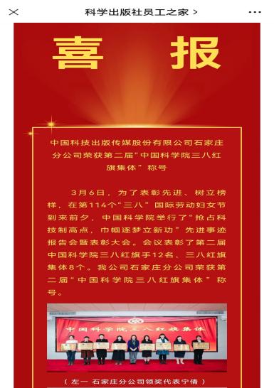 1.我社石家莊分公司榮獲“中國科學(xué)院三八紅旗集體”稱號,在公司“科學(xué)出版社員工之家”公眾號進(jìn)行同步報道。