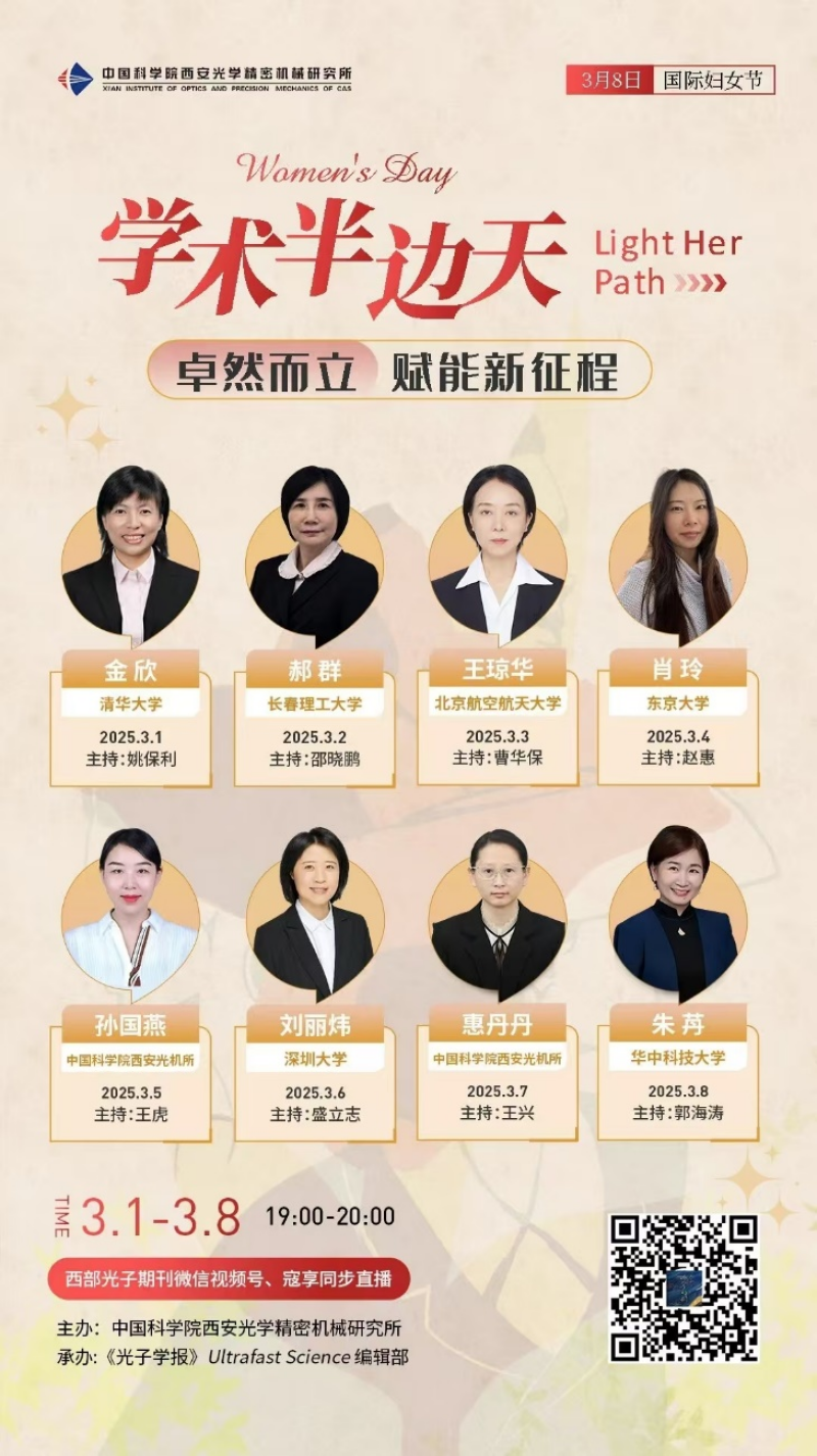 3月1日至8日,西安光機所特別策劃了“學(xué)術(shù)半邊天”直播活動。每晚7點,西部光子期刊視頻號及寇享平臺在線直播,每日邀請一位知名專家分享光學(xué)、光子學(xué)等領(lǐng)域的學(xué)術(shù)前沿。這一活動不僅展示了女性科研工作者在學(xué)術(shù)領(lǐng)域的卓越成就,也為廣大科技愛好者提供了寶貴的學(xué)習(xí)機會。女職工們通過直播活動,進一步拓寬了學(xué)術(shù)視野,激發(fā)了科研創(chuàng)新的熱情。