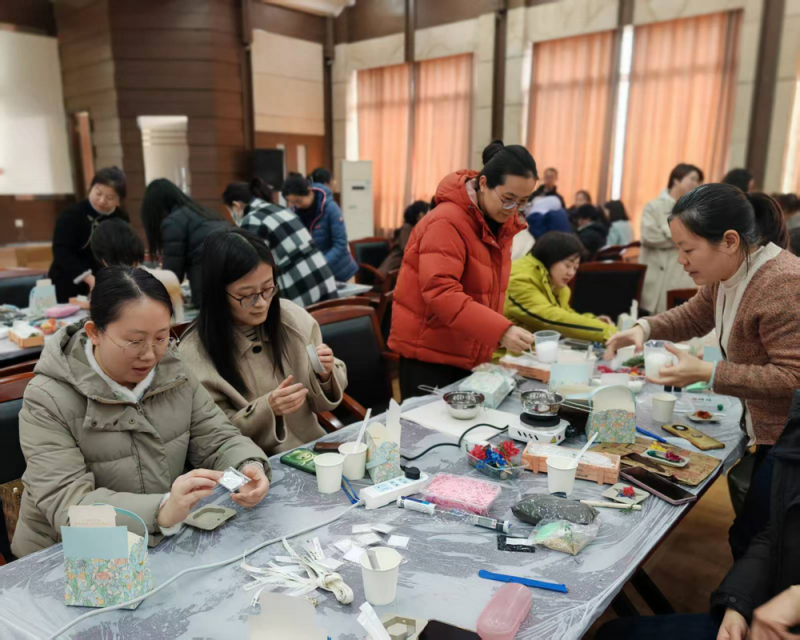 活動(dòng)伊始,手工老師講解了香薰蠟片的原料特性及制作工藝?。女職工們圍坐在布置雅致的工作臺(tái)前,將大豆蠟與蜂蠟加熱融化,加入精油調(diào)香及染料調(diào)色,緩緩倒入模具中,待蠟液半凝固時(shí)嵌入干花等裝飾。在氤氳香氣中,大家專注地雕琢每一處細(xì)節(jié):有的將玫瑰與尤加利葉搭配出復(fù)古格調(diào),有的用薰衣草與薄荷營(yíng)造清新氛圍。隨著蠟片逐漸冷卻成型,一件件兼具實(shí)用性與藝術(shù)性的香薰作品躍然眼前,活動(dòng)現(xiàn)場(chǎng)彌漫著舒緩寧?kù)o的氣息。