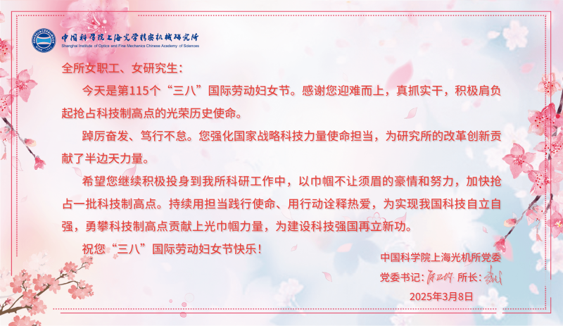 2025年是“十四五”規(guī)劃收官、“十五五”規(guī)劃謀劃之年,也是上海光機所搶占科技制高點的關(guān)鍵之年。為了隆重慶祝三八國際勞動婦女節(jié),上海光機所婦委舉行了系列主題活動,為研究所搶占激光科技制高點貢獻巾幗力量。