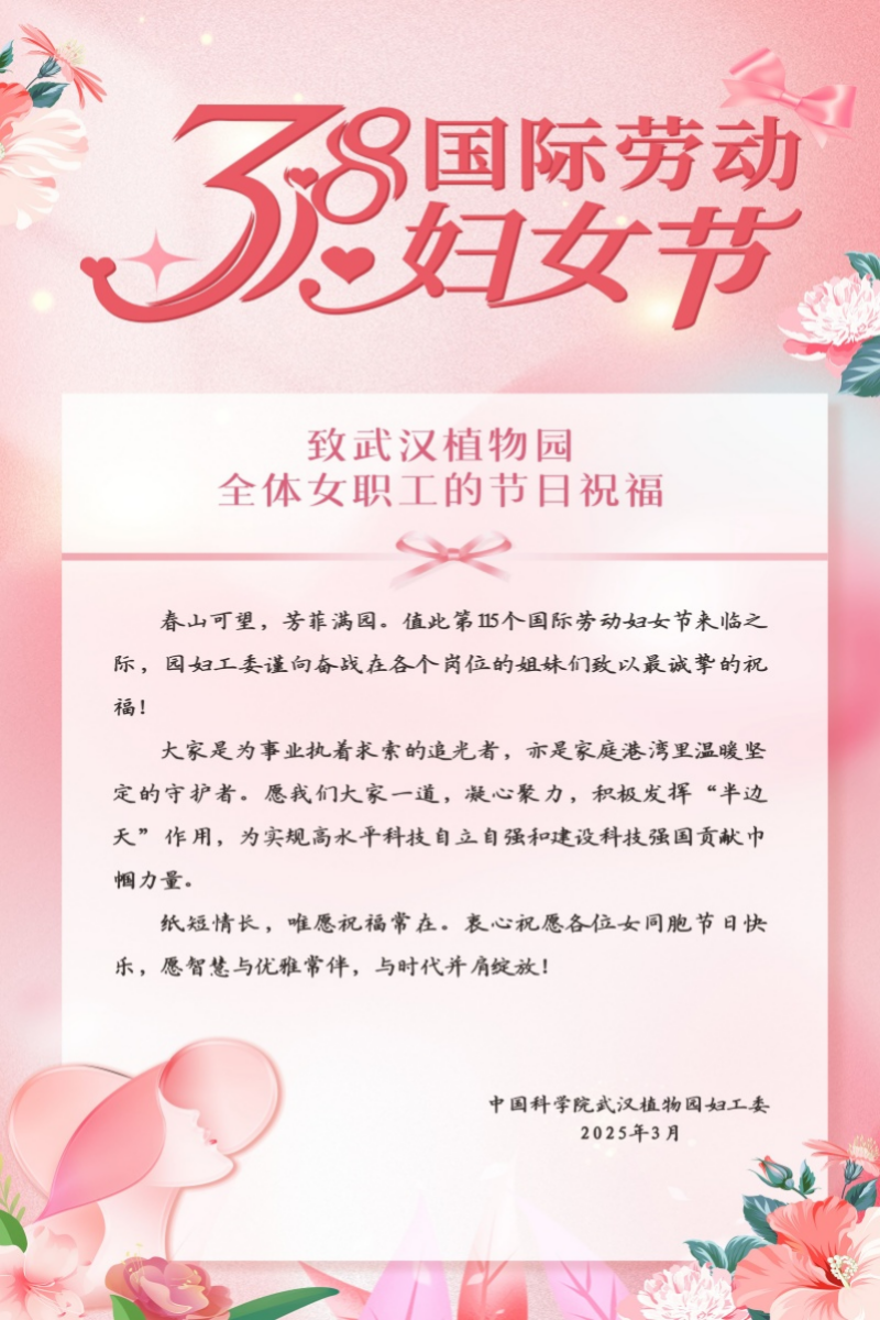 春風(fēng)有信,花開(kāi)有期! 為展現(xiàn)新時(shí)代女性科技工作者的巾幗風(fēng)采,凝聚婦女力量,2025年3月,武漢植物園婦工委深入開(kāi)展“巾幗建新功 奮斗新征程”主題行動(dòng),以創(chuàng)新女職工思想政治引領(lǐng)為先導(dǎo),聚焦女職工凝心聚力、涵養(yǎng)家風(fēng)、關(guān)心關(guān)愛(ài),團(tuán)結(jié)引領(lǐng)廣大女職工在建設(shè)科技強(qiáng)國(guó)的火熱實(shí)踐中銳意進(jìn)取,為實(shí)現(xiàn)高水平科技自立自強(qiáng)貢獻(xiàn)巾幗力量。