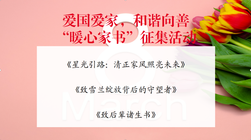 2.愛國(guó)愛大家,和諧齊向善。3月圍繞“愛國(guó)愛家、崇廉尚潔、和諧友愛、向上向善”開展 “暖心家書”征集活動(dòng)。征集了3封寫給家屬的信,包含科學(xué)家家風(fēng)、廉潔家書等。
