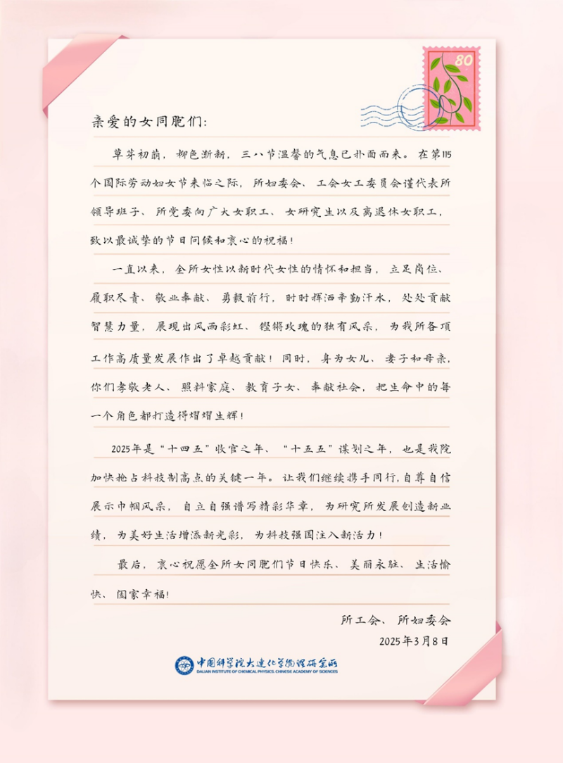 3月8日,為了在所內(nèi)營(yíng)造濃厚的婦女節(jié)節(jié)日氛圍,我所在所網(wǎng)站和專屬APP上同時(shí)發(fā)布了《致全所女同胞“三八婦女節(jié)”慰問信》。在慰問信中,所領(lǐng)導(dǎo)班子、所黨委向一直以來為我所各項(xiàng)工作高質(zhì)量發(fā)展作出卓越貢獻(xiàn)廣大女性科技工作者,致以最誠(chéng)摯的節(jié)日問候和衷心的祝福。同時(shí),在我所微信公眾號(hào)等新媒體平臺(tái)發(fā)布優(yōu)秀女性科技工作者專題宣傳視頻,以她們?yōu)榈湫停膭?lì)廣大女性科技工作者自尊自信展示巾幗風(fēng)采,自立自強(qiáng)譜寫精彩華章,為研究所發(fā)展創(chuàng)造新業(yè)績(jī)。