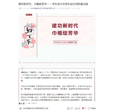春暖大地,芳華競放,為慶祝第115個“三八”國際婦女節(jié),深入落實《中國科學院關于開展“科苑女性活動月”的通知》文件精神,2025年3月中科院建筑設計研究院有限公司開展了十項創(chuàng)新活動,內(nèi)容豐富、形式獨特、反響熱烈。