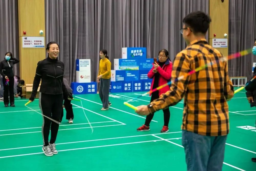 科學(xué)健身互動體驗環(huán)節(jié)配備了飛盤擲準、毽球、跳繩、呼啦圈、彈力棒、波速球等運動器材,國家體育總局社體中心還特別邀請了國家級社會體育指導(dǎo)員和國家級教練員來到現(xiàn)場,指導(dǎo)大家科學(xué)參與健身活動,同時還為參與者準備了健身促健康大禮包。