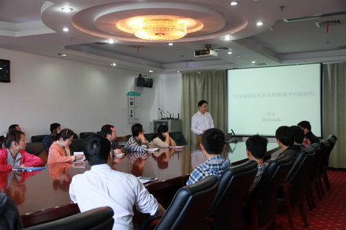 座談交流部分,首先由新引進(jìn)研究員曹晟博士作了題為《冷凍透射電鏡技術(shù)及其在病毒學(xué)中的應(yīng)用》專題報告,該報告從透射電子顯微鏡的發(fā)明開始,講解了透射電鏡的結(jié)構(gòu)和原理,分析了冷凍電鏡在病毒結(jié)構(gòu)分析方面相對于普通電鏡的優(yōu)勢,并對兩種冷凍電鏡技術(shù)——單顆粒重構(gòu)技術(shù)和冷凍斷層掃描技術(shù)進(jìn)行了介紹,并通過HIV的結(jié)構(gòu)學(xué)研究展示了冷凍電鏡技術(shù)的強(qiáng)大功能應(yīng)用。本次報告讓青年科研人員了解了最新的結(jié)構(gòu)生物學(xué)研究手段和技術(shù),為進(jìn)一步提升科研水平提供了參考。隨后,黨委副書記、副所長肖庚富介紹了研究所組織申報生物安全大科學(xué)中心計劃的最新進(jìn)展,以及該中心的定位、建設(shè)目標(biāo)、組織架構(gòu)等。青年人員就關(guān)心的大科學(xué)中心的人才隊伍結(jié)構(gòu)、科研方向以及青年人才培養(yǎng)機(jī)制等與肖庚富副書記進(jìn)行了交流,最后肖庚富副書記指出,青年科研人員是研究所科技創(chuàng)新的中堅力量,希望大家按照中科院新時期“四個率先、三個面向”的辦院方針,在科學(xué)研究中將國家需求與個人興趣有機(jī)結(jié)合,進(jìn)一步做好科研工作規(guī)劃,共同推進(jìn)研究所的整體跨越發(fā)展。