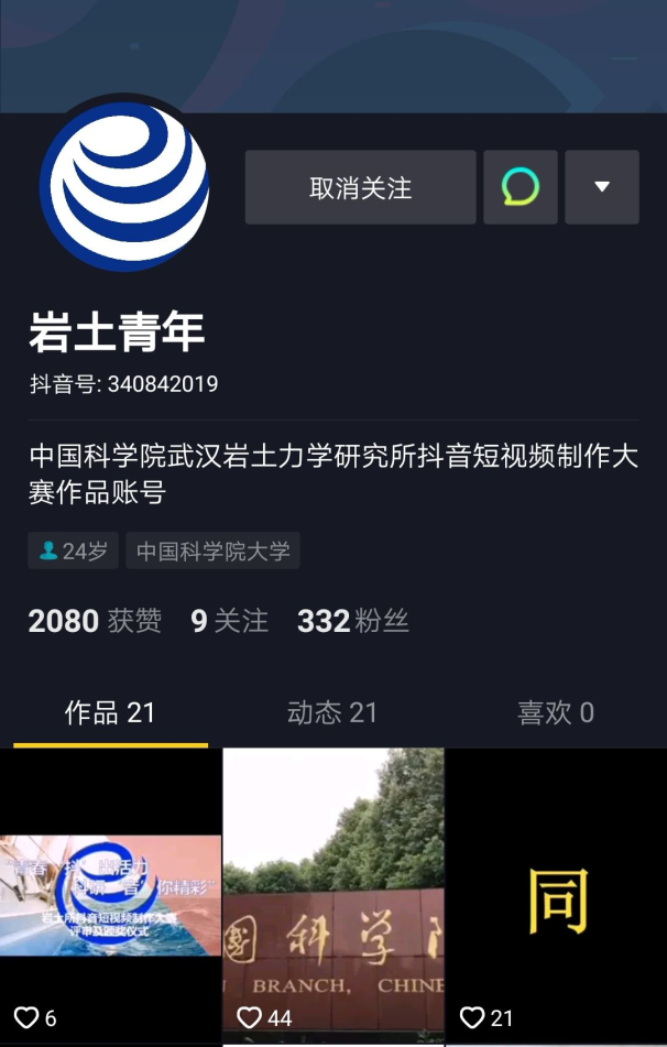 此次活動時值新中國成立70周年、中國科學(xué)院建院70周年,有效利用了當(dāng)前流行的新媒體平臺,上傳的作品積極陽光,特色鮮明,用獨(dú)特的方式展現(xiàn)了科苑生活的魅力,激發(fā)了巖土所學(xué)子們的創(chuàng)造力和表現(xiàn)力,展現(xiàn)了新時代新青年的新風(fēng)貌,也增強(qiáng)了學(xué)生們的愛國、愛院、愛所情懷。(“巖土青年”抖音號已經(jīng)推送了本次活動的全部精彩視頻)