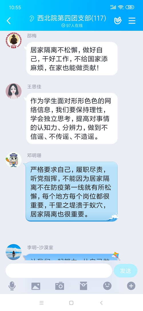 西北生態(tài)環(huán)境資源研究院第四團支部:2020年的這個冬天并不尋常,武漢、湖北、全國人民都遭受著疫情帶來的悲傷、離別、焦慮。作為一名研究生,我們也在持續(xù)關注著疫情的發(fā)展,也無時無刻不被奮戰(zhàn)在一線的防疫工作者、“火神山”建設者、“硬核”村干部感動著,也因為看到多個國家的支援物資而眼含熱淚,相信只要我們團結一心、眾志成城,我們一定會戰(zhàn)勝這次疫情。疫情就是命令,防控就是責任。疫情自發(fā)生以來,習近平總書記高度重視,做出一系列重要指示,對疫情防控工作進行研究部署,提出明確要求。在這場沒有硝煙的戰(zhàn)場上,一名名共產(chǎn)黨員挺身而出,廣大黨員干部發(fā)揮了先鋒模范作用,他們自行接力,不忘初心、挺身而出,牢記人民利益高于一切,切實擔負起戰(zhàn)疫情的職責,他們?nèi)σ愿啊⒈M銳出戰(zhàn),始終和群眾并肩作戰(zhàn),帶頭奉獻,積極投身防控疫情第一線。在疫情面前,我們沒有一個人能置身事外,對于廣大人民群眾能做的就是“宅”在家,這是對自己負責,對他人負責,更是對社會、對國家最大的支持。作為我們學生來說,首先堅信在國家和黨的正確指導下,可以戰(zhàn)勝病毒。其次從自身做起,做好自我防護,積極進行自我排查,配合學校,社區(qū)的電話詢問,當面對形形色色的網(wǎng)絡信息,我們要保持理性,學會獨立思考,提高對事情的認知力、分辨力,學習有關的防控知識,鍛煉身體,提高身體素質(zhì),做到不恐惶、不信謠、不傳謠、不造謠。疫情還未結束,醫(yī)護人員依然堅守在防控崗位,聽黨指揮,嚴格要求自己,不聚會,少外出,勤洗手,戴口罩,履職盡責,不能因為居家隔離不在防疫第一線就有所松懈,每個地方每個崗位都很重要,千里之堤潰于蟻穴,居家隔離也很重要。相信祖國,相信黨,勝利的曙光已經(jīng)在路上。茍利國家生死以,豈因禍福避趨之,磨難壓不垮、奮起正當時。在舉國上下萬眾一心、眾志成城做好新冠肺炎疫情防控工作的特殊時刻,我們堅持居家隔離不松懈,在大戰(zhàn)中堅定信心、不負韶華,我們更堅信這場防疫攻堅戰(zhàn)的成功指日可待,珞珈櫻盛,華夏同心。