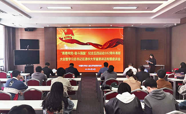4月28日下午,中國科學院大連化學物理研究所團委在能源基礎樓一樓會議室舉行“青春向黨·奮斗強國”紀念五四運動102周年表彰大會暨學習總書記在清華大學重要講話專題座談會。黨委副書記、紀委書記毛志遠,相關職能部門負責人,團委委員,各團支部成員參加此次會議。