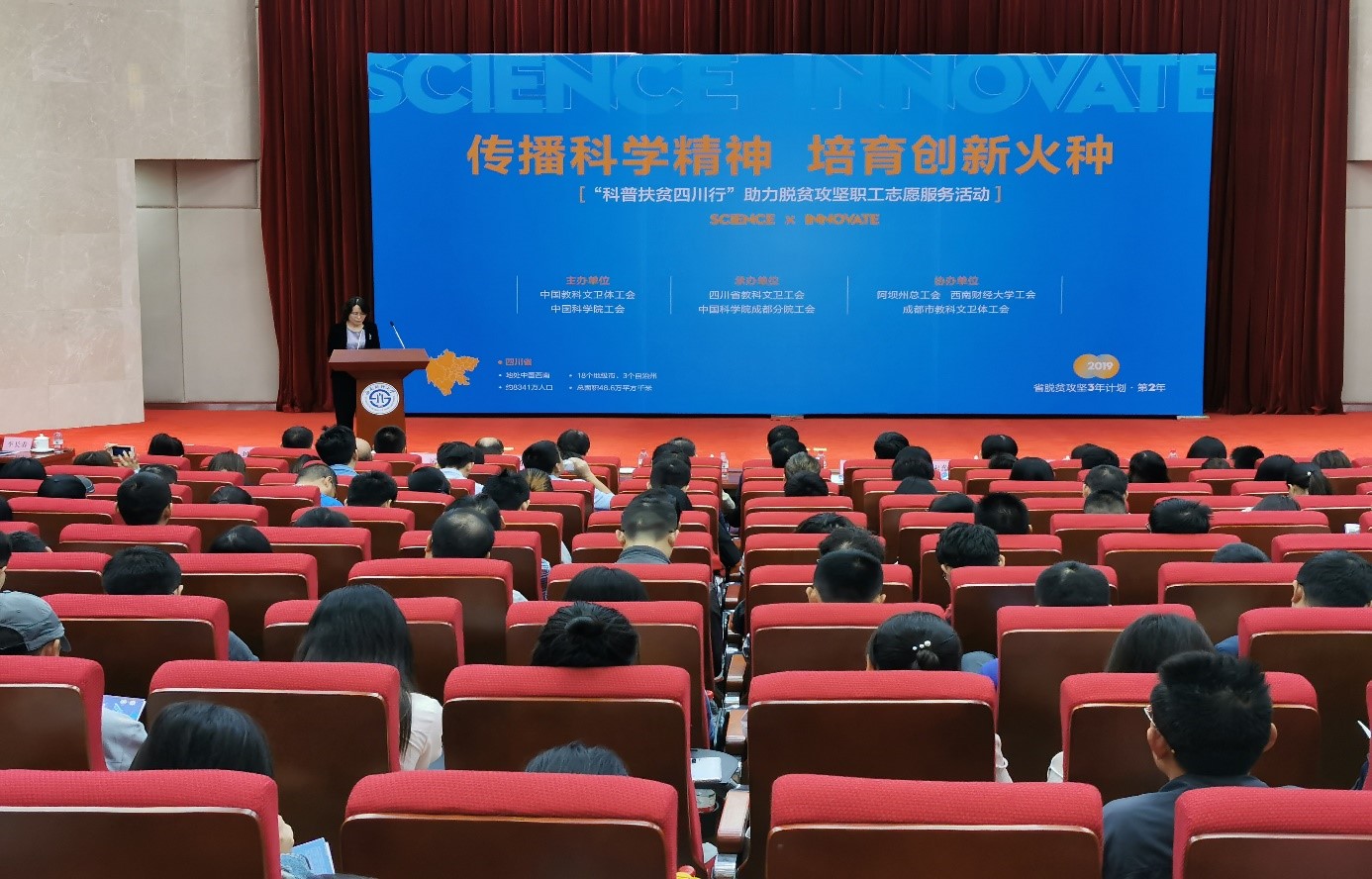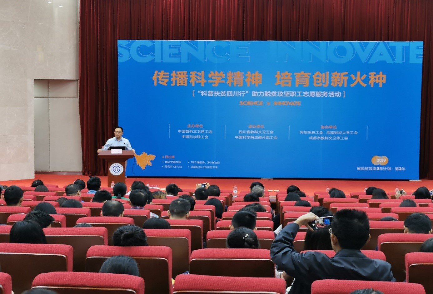 此次活動(dòng)以“傳播科學(xué)精神 培育創(chuàng)新火種”為主題,通過(guò)贈(zèng)送800冊(cè)優(yōu)質(zhì)科普讀物、開(kāi)展多場(chǎng)科普講座、印發(fā)網(wǎng)絡(luò)科普資源宣傳折頁(yè)等方式,營(yíng)造愛(ài)科學(xué)、學(xué)科學(xué)、用科學(xué)的良好氛圍。在接下來(lái)的志愿服務(wù)活動(dòng)中,中國(guó)科學(xué)院大學(xué)心理健康教育中心主任肖斌,中國(guó)科學(xué)院化學(xué)研究所研究員、博士生導(dǎo)師江浪,中國(guó)科學(xué)院國(guó)家天文臺(tái)研究員、博士生導(dǎo)師姜曉軍,中科院水利部成都山地災(zāi)害與環(huán)境研究所研究員、博士生導(dǎo)師陳寧生等專(zhuān)家,為四川的2000余名教師、學(xué)生和社會(huì)公眾送去五場(chǎng)有關(guān)心理、化學(xué)、天文學(xué)、地質(zhì)災(zāi)害防治的科普?qǐng)?bào)告,把最新的科學(xué)知識(shí)、科學(xué)思想和科學(xué)方法送到貧困地區(qū),激發(fā)貧困地區(qū)青少年崇尚科技的興趣和立志成才的志向,將扶貧同扶智和扶志更好地結(jié)合,為打贏脫貧攻堅(jiān)戰(zhàn)注入了智慧和力量。