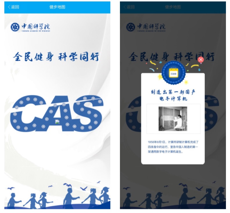 本次線上健步走活動(dòng),是中科院體協(xié)組織開(kāi)展的“全民健身日”活動(dòng)的重要內(nèi)容之一,通過(guò)“中科院云工會(huì)”平臺(tái)進(jìn)行。其中的健步虛擬地圖,每天彈出一項(xiàng)中科院大事記。大家積極參與的同時(shí),不僅獲得了適度鍛煉,也增進(jìn)了對(duì)院情院史的了解。