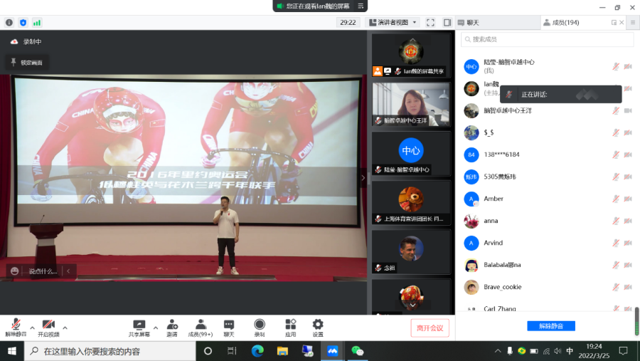 聆聽勵(lì)志故事,感受榜樣力量。2022年3月25日晚,中國(guó)科學(xué)院腦科學(xué)與智能技術(shù)卓越創(chuàng)新中心舉辦了“一起向未來”上海奧運(yùn)健兒&上海體育宣講團(tuán)云分享活動(dòng)。此次活動(dòng)由上海市體育局主辦,腦智卓越中心承辦。兩名上海籍奧運(yùn)健兒,場(chǎng)地自行車兩屆奧運(yùn)會(huì)冠軍鐘天使、花樣游泳奧運(yùn)會(huì)亞軍、亞運(yùn)會(huì)冠軍黃雪辰,以云分享的形式與腦智卓越中心師生互動(dòng)。本次活動(dòng)由上海市體育局團(tuán)委書記崔燕主持。