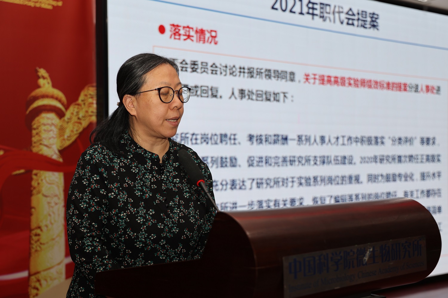 按照要求,錢韋所長做了“有關事宜報告”,各位代表對相關事宜進行投票審議,會議通過了表決事項。隨后,楊海花代表職代會提案組匯報了2021年度職代會提案處理情況及本次職代會提案征集情況。人事處處長周暢做了《中國科學院微生物研究所崗位績效工資管理辦法》修訂情況匯報。