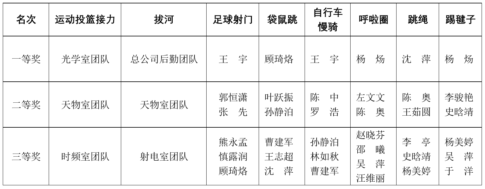 獲得本次運(yùn)動(dòng)會(huì)比賽前三名的結(jié)果如下: