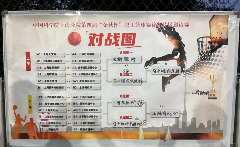 本屆比賽由中科院上海分院工會(huì)、上海分院體育協(xié)會(huì)主辦,中科院上海有機(jī)所工會(huì)、有機(jī)所分體協(xié)承辦,共有來(lái)自上海分院徐匯片區(qū)的8家單位參加,被分為A、B兩組,進(jìn)行小組循環(huán)賽和四強(qiáng)復(fù)賽,分兩個(gè)比賽日進(jìn)行。我所籃球隊(duì)被分在B組,同組的還有以年輕小將為班底的中科院腦智科學(xué)卓越創(chuàng)新中心、上海營(yíng)養(yǎng)與健康研究所以及奪冠呼聲最高的中科院上海有機(jī)所。在11月12日的小組循環(huán)賽中,中心籃球隊(duì)第一場(chǎng)遭遇戰(zhàn)就跟有機(jī)所展開(kāi)了“肉搏”,雙方都把過(guò)多的精力投入到防守中,6分鐘半場(chǎng)結(jié)束,雙方比分僅僅是1:3,分子植物落后2分。經(jīng)過(guò)中場(chǎng)休息,分子植物調(diào)整戰(zhàn)術(shù),加強(qiáng)進(jìn)攻突破和掩護(hù)擋拆,無(wú)奈對(duì)方身高優(yōu)勢(shì),盡管下半場(chǎng)打了個(gè)3:2,最終還是以4:5的比分,1分之差遺憾輸給了有機(jī)所。不過(guò)大家并不氣餒,還開(kāi)玩笑的說(shuō)“籃球比賽很難得的打出了足球的比分”。在接下來(lái)的兩場(chǎng)小組賽中,中心隊(duì)員們?cè)綉?zhàn)越勇,配合也越來(lái)越默契,分別以12:3大比分贏了年輕的腦智中心、11:9有驚無(wú)險(xiǎn)的拿下了營(yíng)養(yǎng)與健康所;以小組第二殺出重圍。