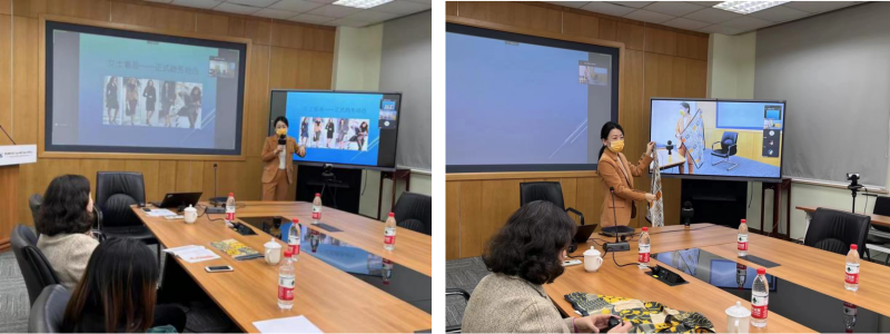 在講座中,李善鈺老師通過圖片展示和親身示范,生動講解了正式場合的職場著裝注意事項(xiàng),強(qiáng)調(diào)職場著裝不應(yīng)該突出性別之分。李老師分別介紹了職場中衣服鞋子的款式選擇、色彩搭配,以及配飾搭配的技巧與禁忌,還演示了站姿、坐姿等基本的職場禮儀。最后詳細(xì)講解了“紐扣款”、“紅領(lǐng)巾款”、“蝴蝶結(jié)款”、“麥穗款”、“電動車款”等幾種絲巾的系法?,F(xiàn)場氣氛熱烈,大家學(xué)習(xí)熱情高漲,紛紛拿起手里美麗的絲巾進(jìn)行學(xué)習(xí)。