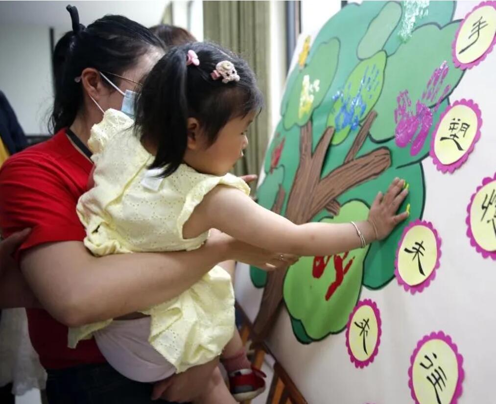 獨(dú)特的打卡簽到方式讓現(xiàn)場(chǎng)活動(dòng)氣氛很快活躍起來?!靶】贫埂眰兒退麄兊母改赣梦孱伭念伭?,以“小手蓋大手”方式按出一個(gè)個(gè)“心”型圖案,在“親子樹”上留下愛的印記。