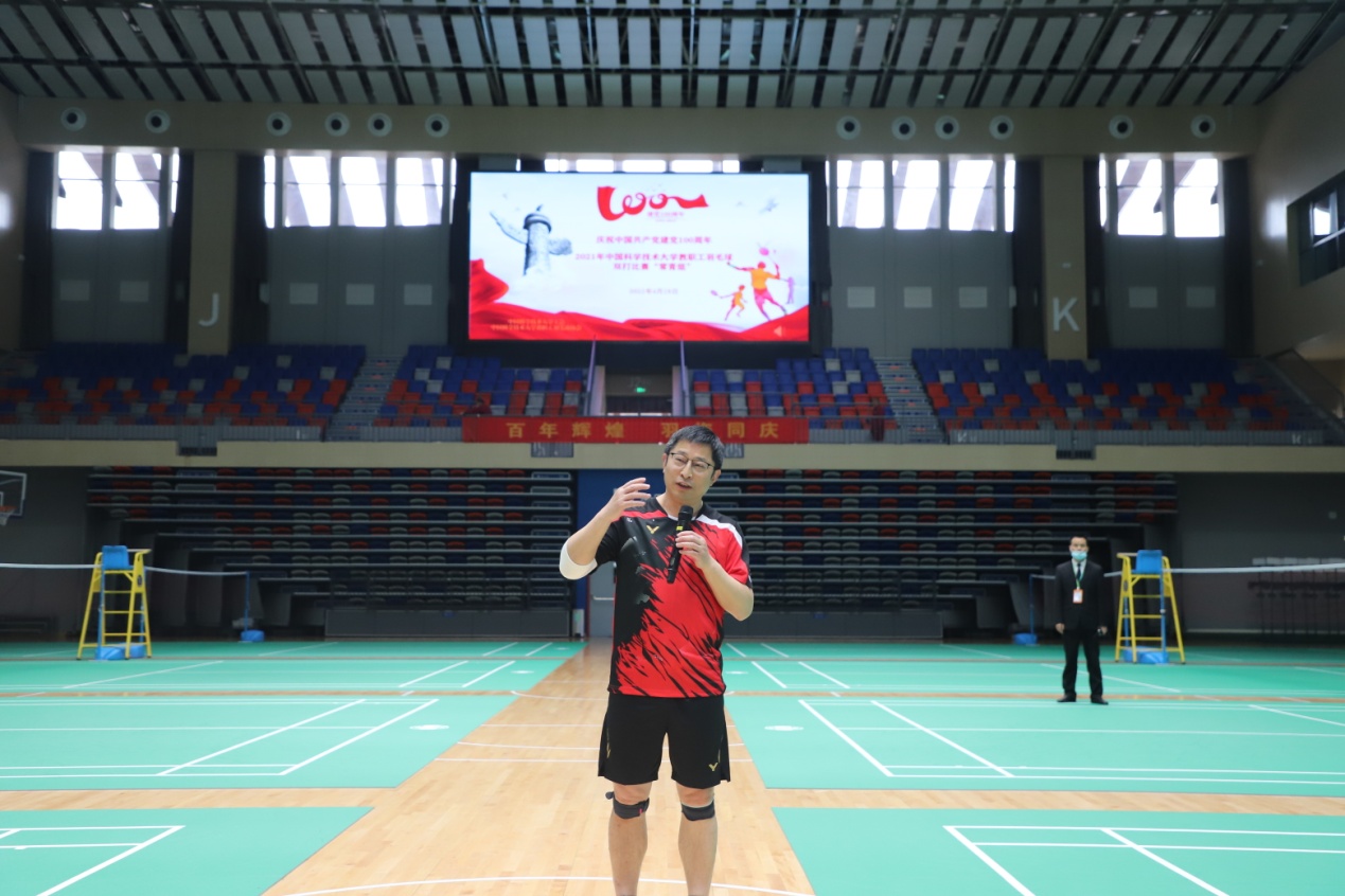 校長(zhǎng)助理、教務(wù)長(zhǎng)、教工羽協(xié)會(huì)長(zhǎng)周叢照在開幕式上講話,他指出教工羽協(xié)經(jīng)過不斷發(fā)展,現(xiàn)在已經(jīng)成為學(xué)校第一大協(xié)會(huì),極大地調(diào)動(dòng)了廣大教職工參與羽毛球運(yùn)動(dòng)的積極性。希望選手們尊重裁判,尊重對(duì)手,賽出風(fēng)格、賽出水平。對(duì)外聯(lián)絡(luò)與基金事務(wù)處處長(zhǎng)、教育基金會(huì)秘書長(zhǎng)周宇表示基金會(huì)將大力支持教職工文體活動(dòng)開展以及學(xué)校體育場(chǎng)館建設(shè),希望教職工們快樂生活、快樂工作、快樂運(yùn)動(dòng)。校工會(huì)副主席朱文婧代表工會(huì)感謝教工羽協(xié)為全校羽毛球愛好者提供了交流技藝、切磋水平的平臺(tái),感謝對(duì)外聯(lián)絡(luò)與基金事務(wù)處、華米科技對(duì)本次活動(dòng)的大力支持。朱文婧指出,本次比賽,是校工會(huì)組織開展的慶祝建黨100周年系列活動(dòng)中文體協(xié)會(huì)組織的首場(chǎng)活動(dòng)。近年來,校工會(huì)一直通過組織各種形式的活動(dòng)努力讓更多教職工,特別是教學(xué)科研一線的教職工參與運(yùn)動(dòng),收獲健康,共享快樂,全方位提升教職工的幸福感,獲得感和滿足感。希望教工羽協(xié)等協(xié)會(huì)能夠充分發(fā)揮平臺(tái)作用,讓更多的教職工參與運(yùn)動(dòng),豐富教職工的業(yè)余文化生活,增強(qiáng)身體素質(zhì),通過組織開展各類比賽活動(dòng),交流經(jīng)驗(yàn)、增進(jìn)團(tuán)結(jié)、凝聚人心,營造健康校園的氛圍。出席開幕式的還有華米科技聯(lián)合創(chuàng)始人兼副總裁章曉軍等。開幕式由教務(wù)處副處長(zhǎng)、教工羽協(xié)秘書長(zhǎng)吳強(qiáng)主持。