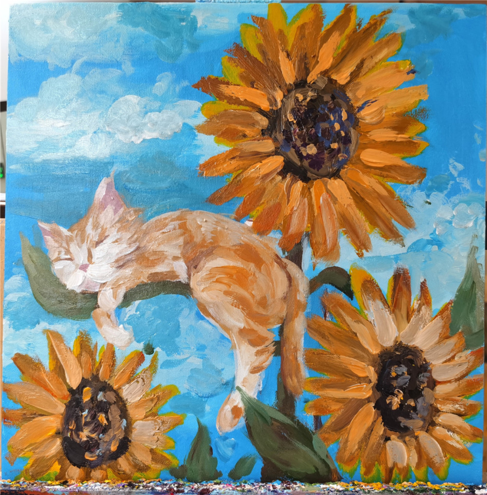 作品簡介:藍(lán)天白云、橘貓葵花,所有明亮的元素使用油畫的方式顯得整個畫面更加地溫暖熱烈了。向日葵象征著積極陽光,給人以希望。胖胖的橘貓慵懶地倚著葵花做著甜甜的夢,你猜她會夢見什么呢?