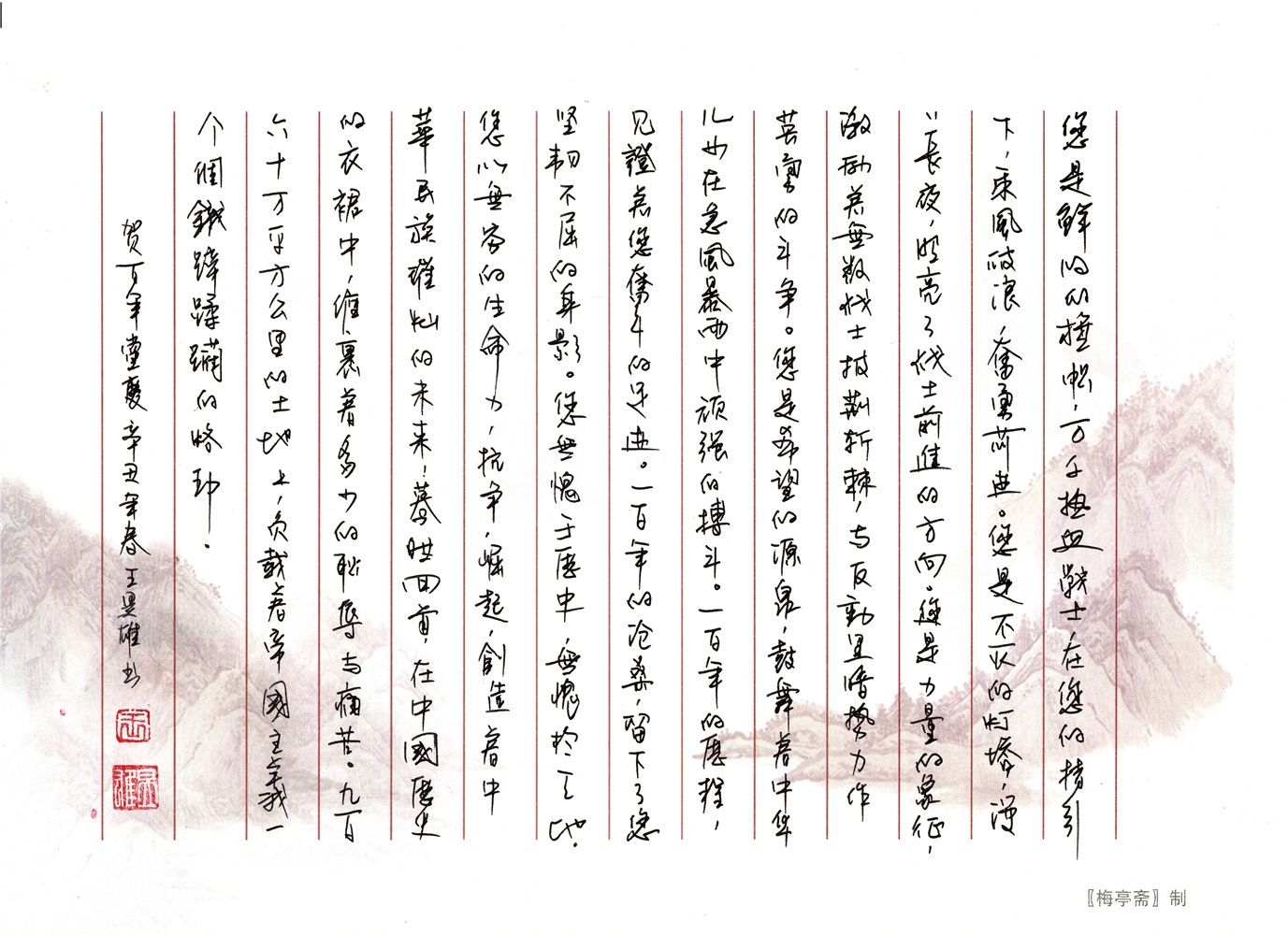 作品簡(jiǎn)介:行書乃中國(guó)傳統(tǒng)書體,其書寫流暢,筆走龍蛇,直抒胸臆,酣暢痛快,羲之蘭亭,顏公祭侄,東坡寒食,非行書無以表達(dá),與詩(shī)歌表現(xiàn)手法上有異曲同工之妙。在此黨慶百年之際,特摘佳作以行書賀之。