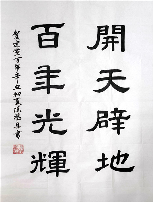 作品簡介:百年前,中國共產黨誕生,經過不懈努力奮斗,付出無數流血犧牲,創(chuàng)造無數世界奇跡,最終鑄就了如今光輝燦爛的新中國。有感于此,八個字躍然于作者胸中。作品正文為四字對句,用隸書呈現以體現歷史厚重感,落款為行書。