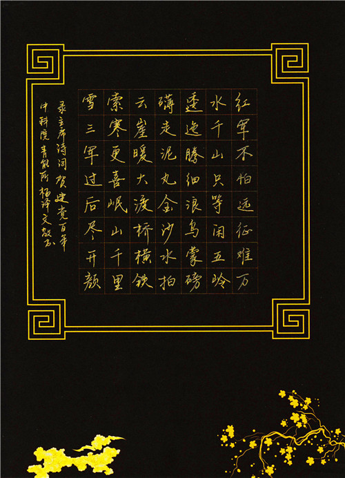 作品簡(jiǎn)介:摘錄毛澤東主席的《七律·長(zhǎng)征》紅軍不怕遠(yuǎn)征難,萬(wàn)水千山只等閑。五嶺逶迤騰細(xì)浪,烏蒙磅礴走泥丸。金沙水拍云崖暖,大渡橋橫鐵索寒更。喜岷山千里雪,三軍過(guò)后盡開(kāi)顏。