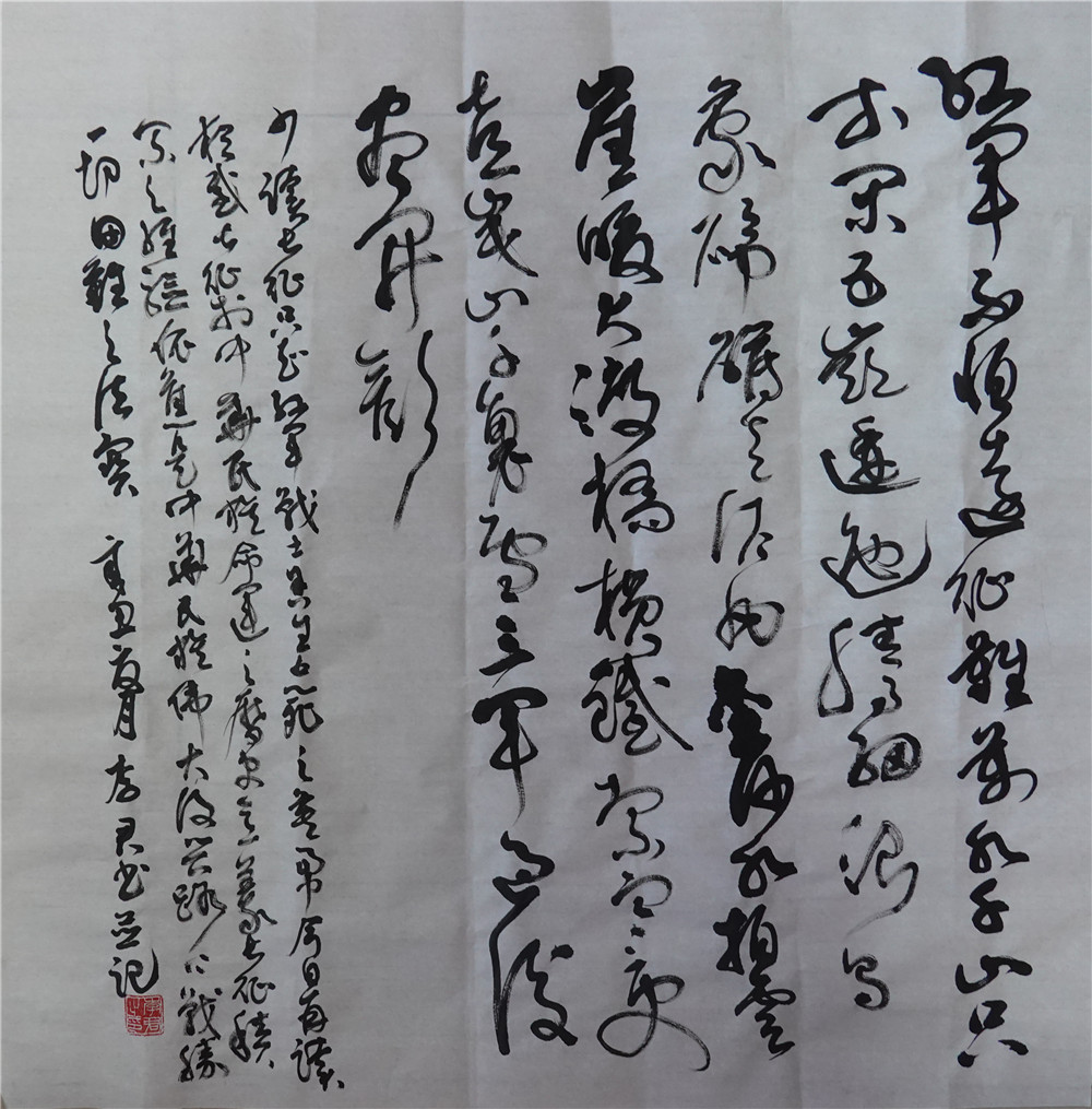 作品簡介:少讀長征,只知紅軍戰(zhàn)士舍生忘死之英勇。今日再讀,尤感長征于中華民族命運(yùn)之歷史意義。長征積累之經(jīng)驗(yàn),依舊是中華民族偉大復(fù)興路上戰(zhàn)勝一切困難之法寶。創(chuàng)作于2021年5月23日深夜。四尺對(duì)開斗方,草書毛主席七律《長征》,正文后附作者學(xué)習(xí)中國共產(chǎn)黨黨史小記。創(chuàng)作材料:羊毫、半生宣、一得閣墨汁。辛丑夏月,李君書并記。