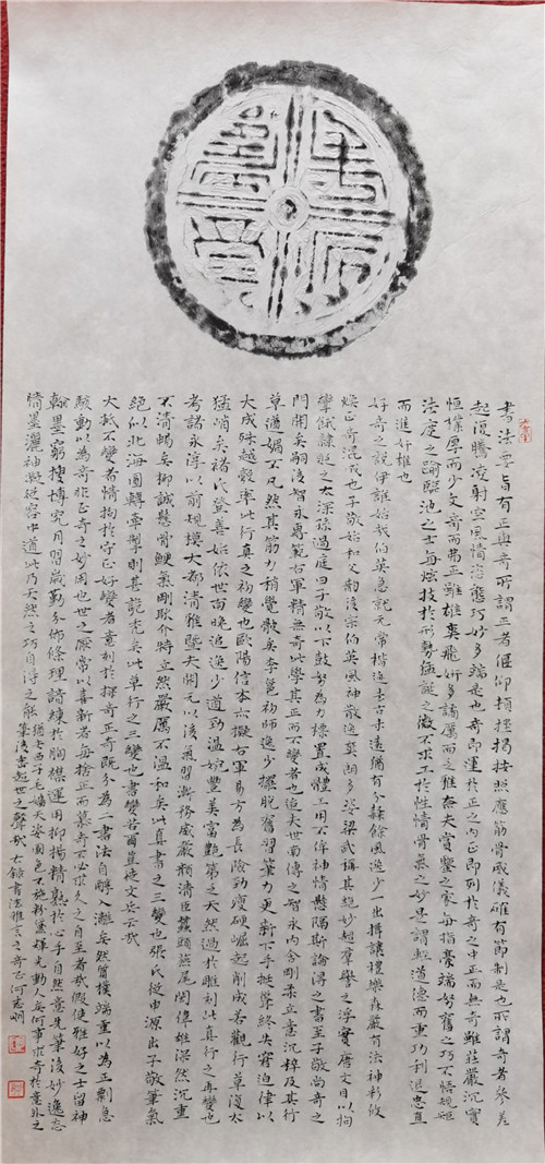 作品簡(jiǎn)介:作品以《書(shū)法雅言》奇正篇為創(chuàng)作載體,取法鐘王,欲達(dá)正中有奇。紙張使用四尺三開(kāi)純白宣紙,配以瓦當(dāng)拓片,形式上是個(gè)斗方,章法上力求一種古樸自然之美,蕭遠(yuǎn)恬靜之雅。