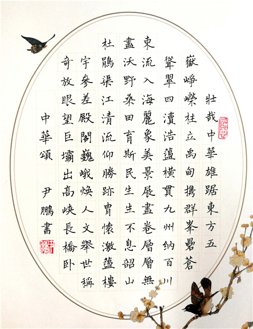 作品簡介:此作品通過節(jié)選新時代題材詩歌和采用近現(xiàn)代書寫工具,來弘揚傳統(tǒng)書法藝術(shù)。文字內(nèi)容摘自《中華頌》,原作為慶祝建國六十周年而作的詞賦書法作品,贊美了祖國大好河山和華夏民族文化。