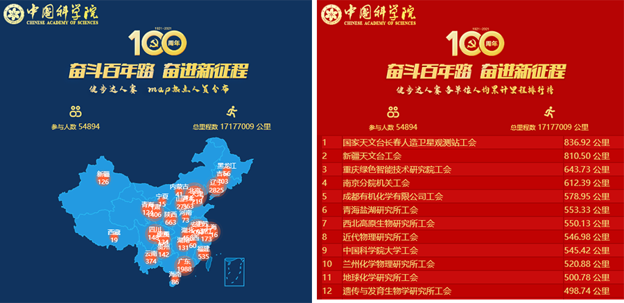 為慶祝中國共產(chǎn)黨成立100周年,中科院工會(huì)、體協(xié)結(jié)合黨史學(xué)習(xí)教育,聚焦職工健康期盼,在全院范圍內(nèi)舉辦了“奮斗百年路 奮進(jìn)新征程”線上健步達(dá)人賽?;顒?dòng)始于3月23日,止于6月30日,歷時(shí)100天,線上參賽近5.5萬人,覆蓋全國31個(gè)省區(qū)市,總里程達(dá)1700余萬公里,活動(dòng)規(guī)模創(chuàng)造了中科院全民健身單項(xiàng)活動(dòng)的歷史紀(jì)錄。