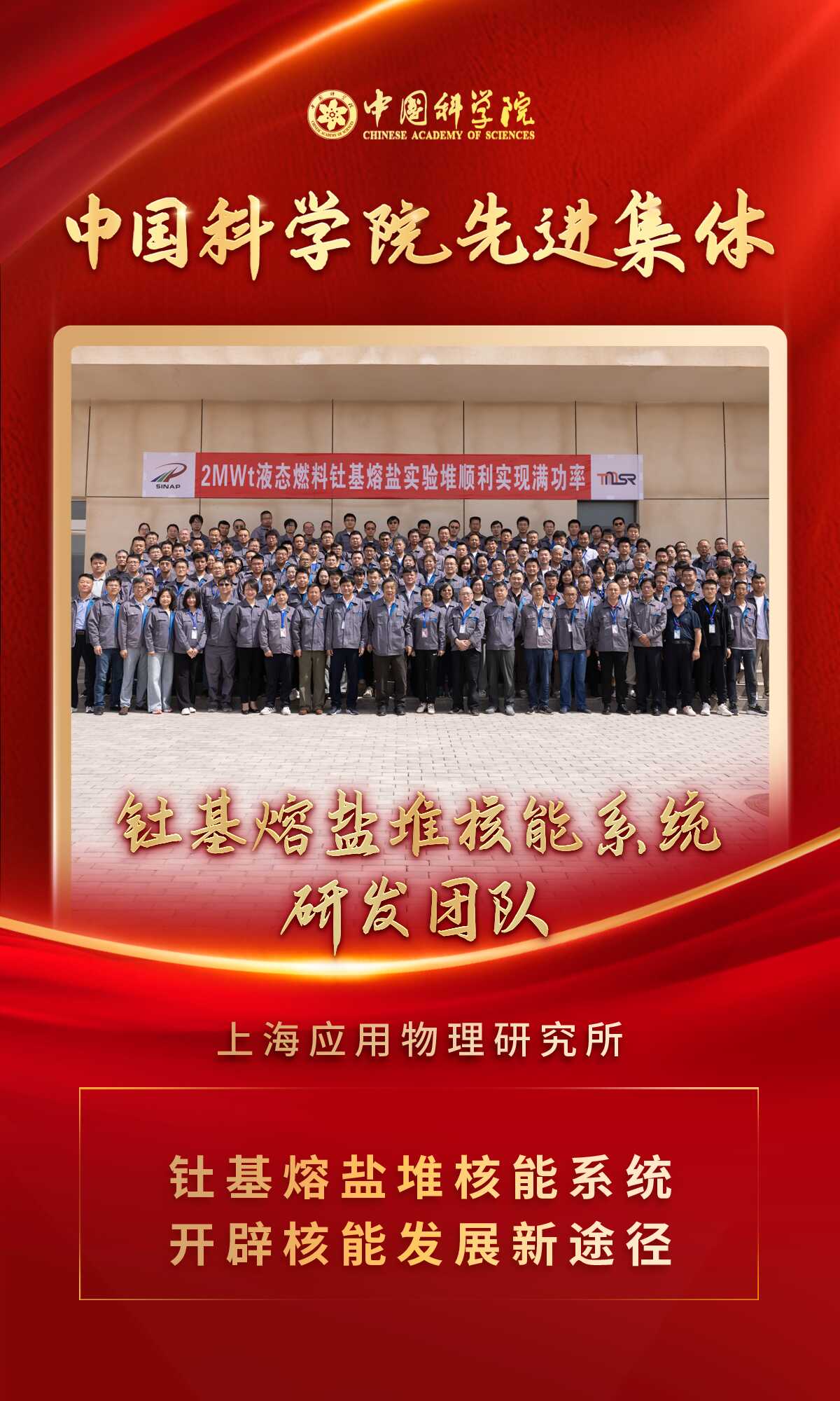 團(tuán)隊(duì)聚焦主責(zé)主業(yè)、保持戰(zhàn)略定力,“十年磨一劍”攻克釷基熔鹽堆關(guān)鍵核心技術(shù),在戈壁灘上建成兩兆瓦液態(tài)燃料釷基熔鹽實(shí)驗(yàn)堆,實(shí)現(xiàn)滿功率運(yùn)行并完成全球首次釷鈾循環(huán)驗(yàn)證實(shí)驗(yàn),標(biāo)志著我國(guó)率先構(gòu)建起獨(dú)具特色的熔鹽堆與釷鈾燃料循環(huán)研究平臺(tái)。團(tuán)隊(duì)不畏艱苦、堅(jiān)韌不拔、團(tuán)結(jié)奮斗,跨越2000公里“候鳥式”攻堅(jiān),取得了一系列關(guān)鍵技術(shù)突破,形成了一批有影響的進(jìn)展成果。目前,團(tuán)隊(duì)正依托中國(guó)科學(xué)院搶占科技制高點(diǎn)重大科技任務(wù)開展百兆瓦級(jí)釷基熔鹽堆核能系統(tǒng)關(guān)鍵技術(shù)攻堅(jiān),為國(guó)家提供安全可靠的釷基能源發(fā)電新路徑奠定基礎(chǔ)。