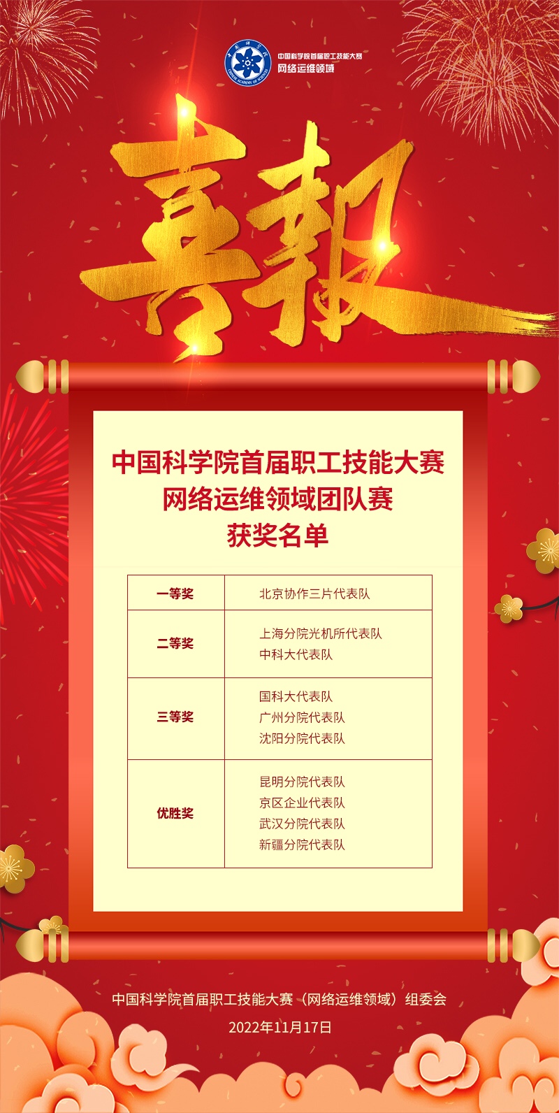 11月17日,中國科學院首屆職工技能大賽網絡運維領域團隊決賽圓滿結束。中國科學院黨組成員、副秘書長,直屬機關黨委常務副書記,院工會主席李和風出席團隊決賽、致辭并頒獎。