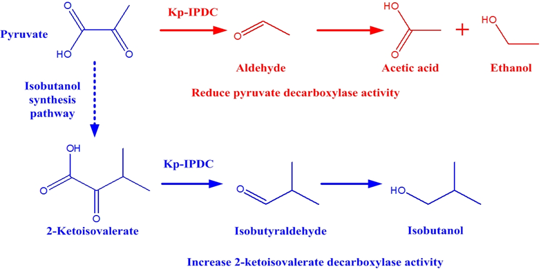 異丁醇是一種高品質(zhì)的汽油替代燃料,與傳統(tǒng)的乙醇燃料相比有很大優(yōu)勢:其能量密度高,接近于汽油;親水性低,能與汽油高比例混合;可以使用現(xiàn)有石油管道進(jìn)行運(yùn)輸?shù)?。如果工業(yè)上能批量生產(chǎn),將成為高效能源產(chǎn)品。在工業(yè)生產(chǎn)過程中,吲哚丙酮酸脫羧酶在異丁醇合成途徑中催化2-酮基異戊酸脫羧形成異丁醛,進(jìn)而合成異丁醇。然而該酶催化2-酮基異戊酸脫羧,也催化丙酮酸脫羧。